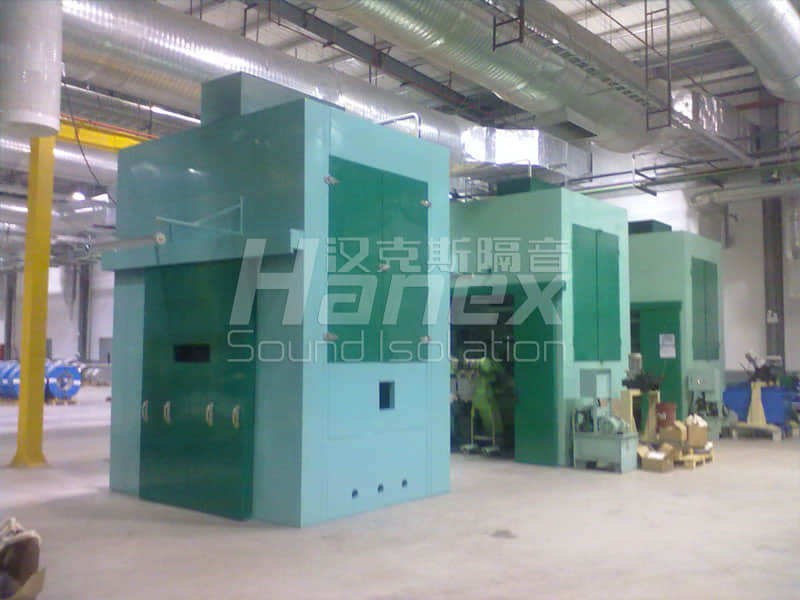案例簡介:廠區(qū)車間內(nèi)有三臺沖床,用于生產(chǎn)汽車零配件,單臺沖床運作時噪聲值在96dB(A),影響較大。漢克斯隔音對三臺沖床分別增設(shè)了隔聲罩后,在隔聲罩1米處量的噪聲值為76dB(A)(單臺)。隔聲罩內(nèi)設(shè)有通風(fēng)散熱等性能,不影響設(shè)備本身使用。