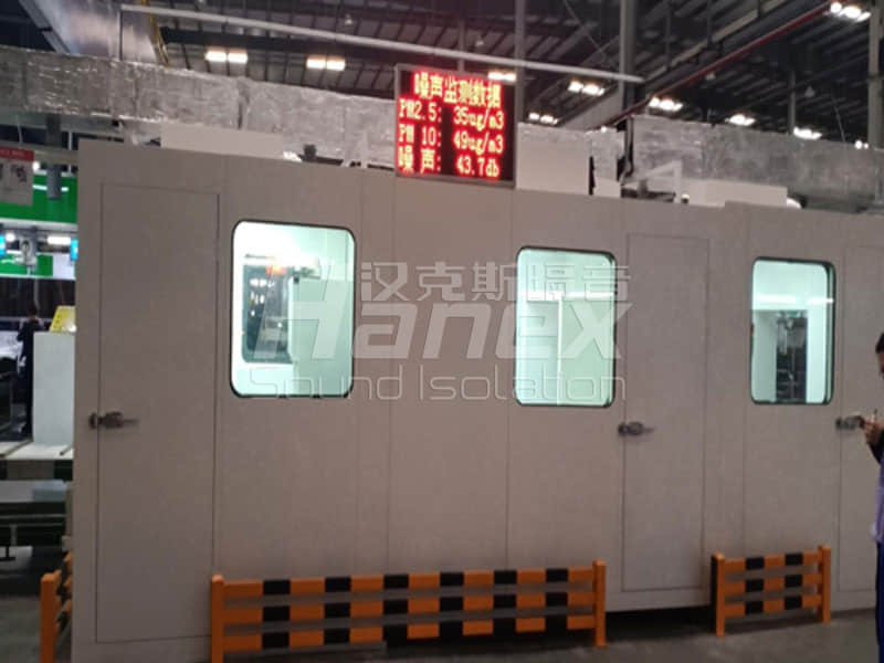 綜合考慮設備之間位置關系、通行通道,以及車間環境美觀和諧,本項目我們漢克斯隔音技術團隊設計,采取對隔音房改造技術要點如下: