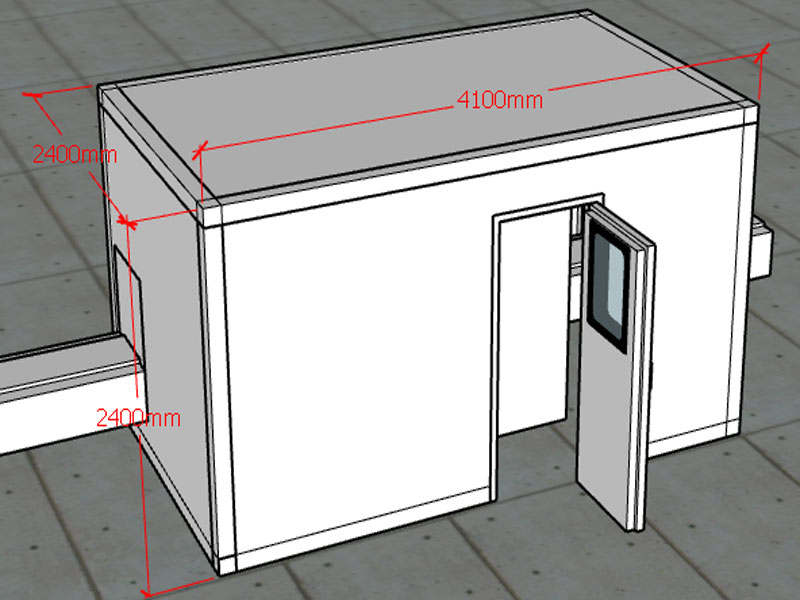 1.1.1根據我司技術人員現場測量,流水線處環境噪聲為75-78dB(A),設計隔音房尺寸為:2400mm*4100mm*2400mm。隔音房板厚120mm,預計隔音房安裝完成后,內部噪聲值降至40dB(A)。