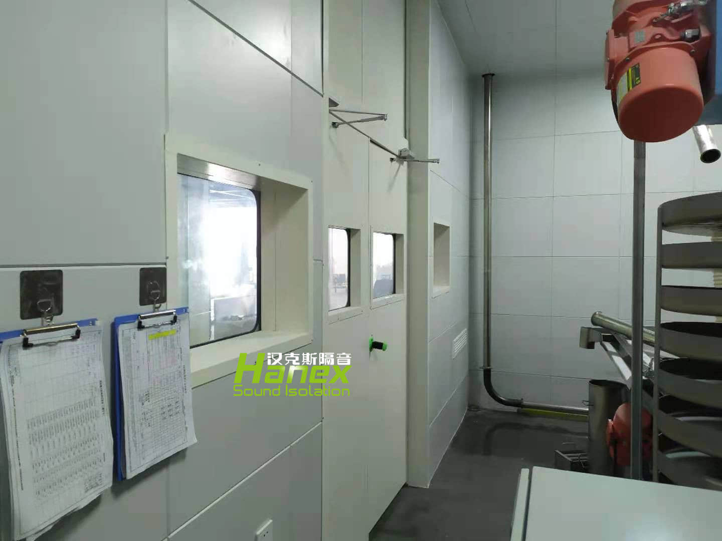 隔聲門為向外雙開隔聲門,大隔聲門尺寸為1800mm(W)×2300mm(H),隔聲門門扇配有圓角設計的透明隔聲觀察窗,同時其中一樘大隔聲門門扇上開設出料口;小隔聲門尺寸為1800mm(W)×1200mm(H),與大隔聲門可上下開啟關閉。