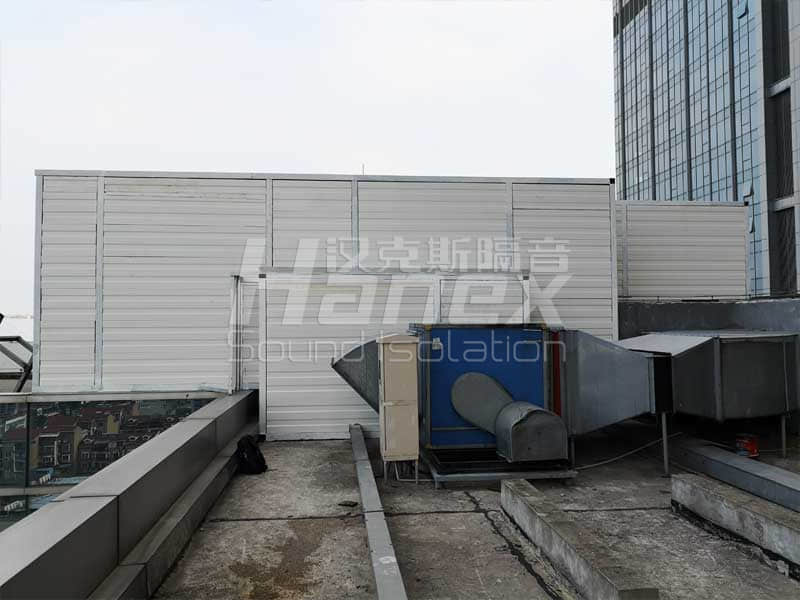 1、經過漢克斯隔音技術人員現場踏勘及結合業主所提供的資料,裙房屋面西北角有P4~P8排油煙風機房,保證其工作運行時產生的噪聲不往外擴散,對P4~P8排油煙風機進行整體安裝隔聲罩。