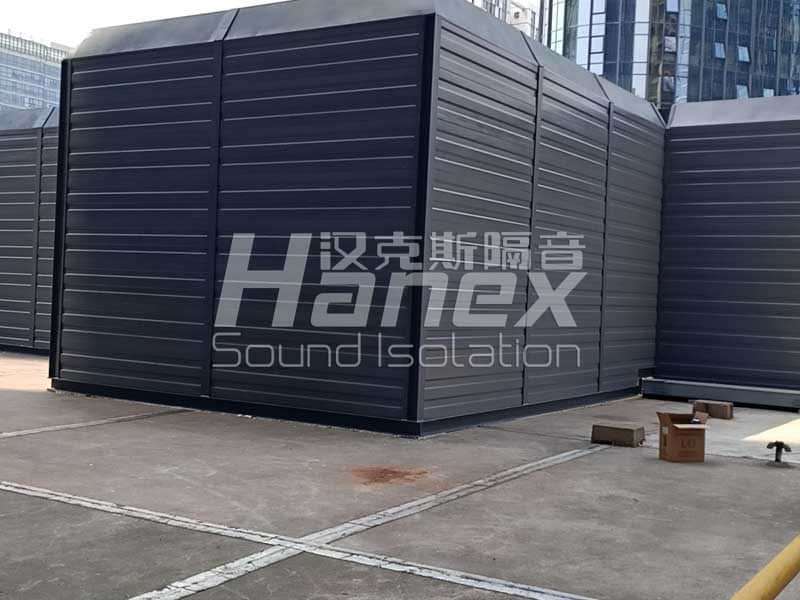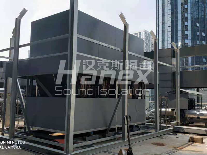 4、現場除了空調機組外,還有3臺水泵電機也需要做降噪措施。我司技術人員商討后決定在其部位安裝隔聲棚,隔聲棚采用鋼制復合吸隔聲板。為保證水泵電機的通風散熱問題,隔聲棚東側及北側敞開。
