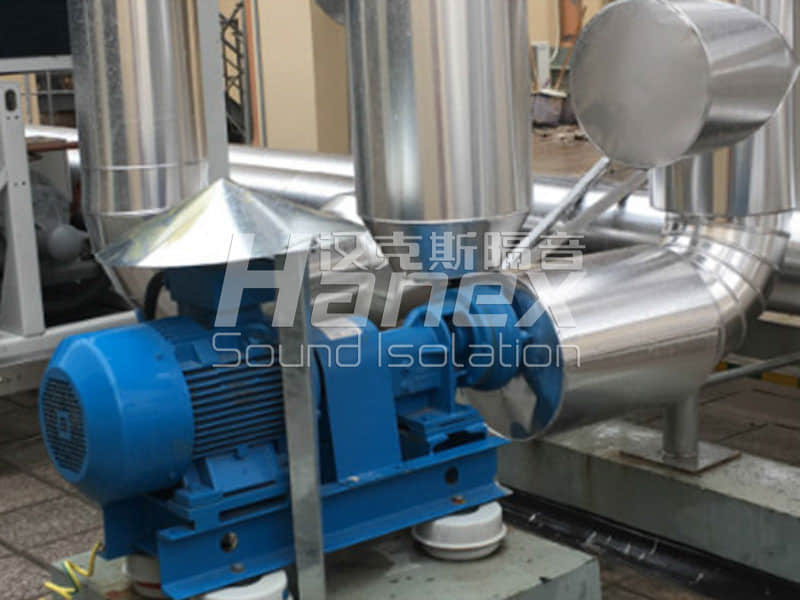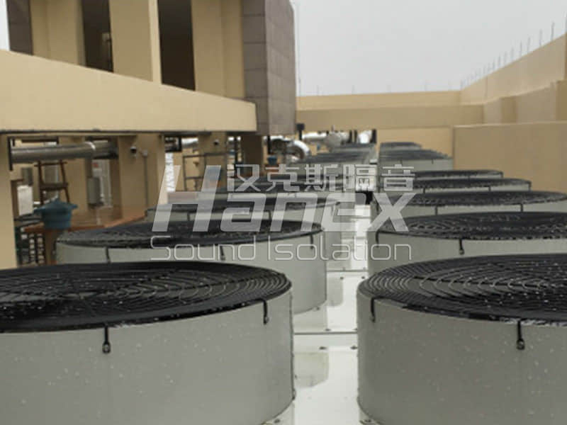 海寧四院住院樓平臺安裝有一組中央空調外機,空調正常開啟狀態下層辦公區及病房區測量噪聲值達56分貝。漢克斯隔音設計1.空調機組減振(空調減震器),2.進水管道減振,達到空調開啟時下層病房內夜間測量值低于40分貝。